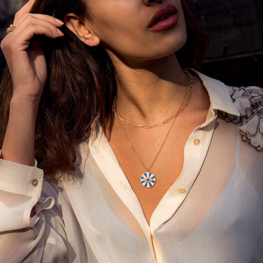 Dainty 14K Gold Layered Evil Eye Religious Necklace- Round Evil Eye+Paperclip