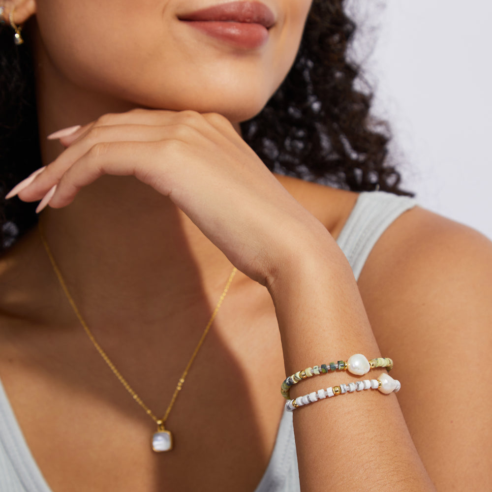 The adjustable design of our bracelet not only enhances its aesthetic appeal but also serves as a reminder of the profound healing power of crystals. Each lime-green Turquoise gemstone and irregular pearl carries its own energetic vibrations, promoting emotional well-being and spiritual growth. Allow the energies to harmonize, restore balance, and ignite your inner healing journey.