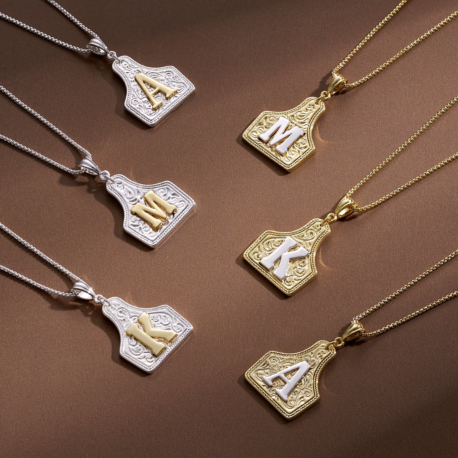 Inspired by Western medallions and rodeo culture, this necklace boasts a bold, statement-making design. Each piece is individually carved with capital initials (A-Z), featuring a striking two-toned gold and silver texture. It's a symbol of pride and personal style. Perfect for men and women, it adds a distinct Western vibe to any outfit.